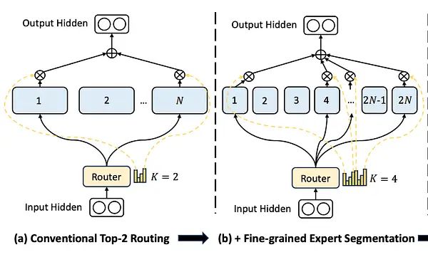 这样,您就可以“抵御”或至少最小化上述标准 MoE 问题,由于专家更加专业,知识冗余度降低,而“更广泛”的数据则由共享专家捕获。