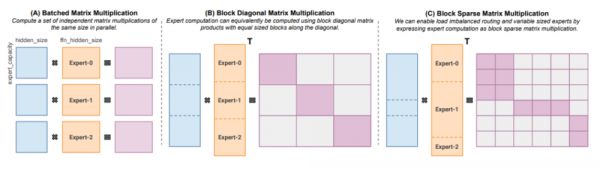 与此同时,Megablocks(2022年11月)则专注于通过开发新型的GPU kernel,高效处理MoE模型中的动态性,以实现更高效的稀疏预训练。其核心优势在于能够充分利用每个令牌的信息,并高效地适应现代硬件架构(特别是支持块稀疏矩阵乘的架构),从而达到显著的加速效果。Megablocks的创新之处在于,它摒弃了传统MoE使用批量矩阵乘法的做法(这种做法通常假设所有专家形状相同且处理相同数量的令牌),而是将MoE层表示为块稀疏操作,能够灵活适应不均衡的令牌分配,从而进一步提升了模型的训练效率和性能。