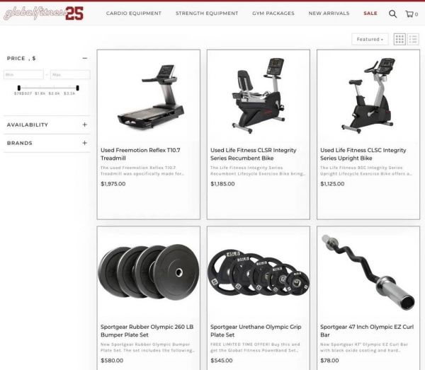 又比如专注于高品质二手健身器械的美国Global Fitness,其销售品牌有HAMMER STRENGTH、MATRIX、以及泰诺健等知名品牌。并主打家庭健身器械套装、力量举器械套装、健身工作室器械套装、循环训练器械套装、以及商业健身房器械套装。以供广大消费者选择。