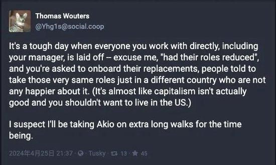 也有其他网友补充道,这次裁员可能是出于成本原因进行的重组,有的团队被彻底解散,有的则将两个团队合并为一个。这是“一种有利于低成本地区人们的模式。例如,两个团队合并,成本较高的经理被解雇,或者整个团队被解雇,但这些职责正在由工资较低的办公室的人员重新安排。”