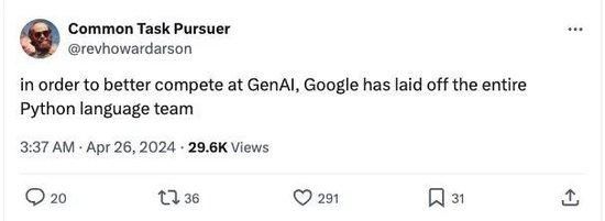 其实上周就有消息称,为了 GenAI,谷歌解雇了整个 Python 团队。