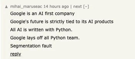 在 AI 时代解雇 Python 团队,很多人表示不能理解:“谷歌是一家 AI 优先的公司,谷歌的未来与其 AI 产品紧密相连。所有 AI 都是用 Python 编写的,谷歌却解雇了所有 Python 团队。”