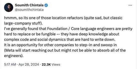 这个消息惊动了领域内的很多开发者,包括 PyTorch 创始人、Meta 杰出工程师 Soumith Chintala,“显然 Google 解雇了整个 Python 基础团队,WTF!”,但“我认为基础 / 核心语言工程师很难被替代或变得可替代。他们拥有关于复杂代码和社交动态(social dynamics)的深厚知识,这些知识很难被记录下来。这对其他公司来说是一个介入和抢人的机会 (Meta 会开始接触他们,但可能无法吸收所有工程师)。”