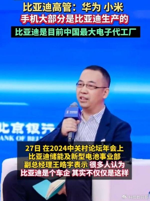 王皓宇:华为、小米手机大部分是比亚迪生产的