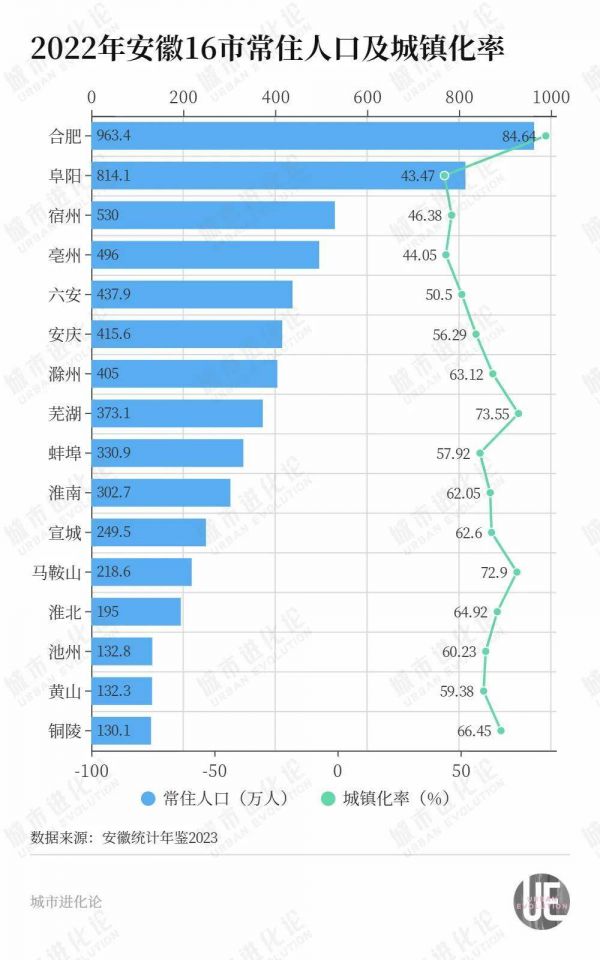 作为安徽省内仅次于合肥的人口第二大市,城镇化水平亦是阜阳的一大短板。安徽省统计年鉴公布的数据显示,2022年,安徽全省城镇化率60.15%,阜阳仅为43.47%,在16个地市中居倒数第一。