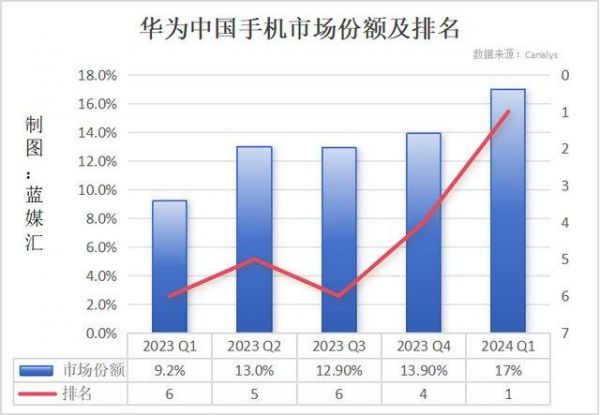 2024年前 6 周,华为手机销量同比增长64%,拿到了17%的市场份额,彼时距离市场第一只差1个百分点。
