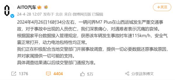 问界 M7 追尾养护车起火致 3 人遇难,车企回应:已成立专项小组,正配合调查