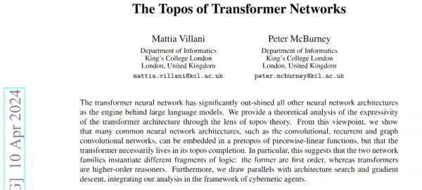 学者们声称从topos(中文译为拓扑斯,笔者觉得翻译得很怪异,可以简单理解为一类特殊的范畴)的角度对神经网络架构做了理论分析,注意到前馈Feed Forward网络架构和Transformer神经网络架构之间的以前未知的差异。一类属于pretopos,另一类则是topos completion。