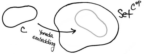 米田嵌入,某种意义上是将范畴C中对象“编码”到范畴 SetCop 。注意Cop与C中对象相同,但是态射都是反向的。米田嵌入其实是米田编码表征,即采用该对象的所有关系来表征该对象。范畴学上称为,X 与 hom(-,X)同态或同构。