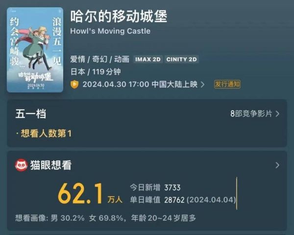 预售不佳,宣发难逃责任。今年五一档各片宣发,好像做了又好像没做。根据猫眼专业版数据,截止目前,累计想看人数最多的电影是重映的《哈尔的移动城堡》。