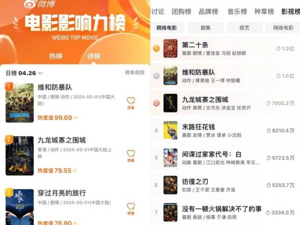 微博热度榜上,《维和防暴队》、《九龙城寨之围城》以及《穿过月亮的旅行》位列前三,《维和防暴队》占有明显优势;抖音话题榜上,则是《九龙城寨之围城》、《维和防暴队》以及《末路狂花钱》分列一二三位;从百度指数上来看,则是《末路狂花钱》居首,《九龙城寨之围城》次之,《维和防暴队》相对弱。
