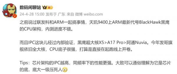 4月28日消息,著名数码博主@数码闲聊站爆料称,联发科下一代旗舰处理器天玑9400将搭载ARM代号为“BlackHawk黑鹰”的CPU架构,IPC提升明显。@数码闲聊站还在评论区表示,得益于黑鹰Cortex-X5超大核,天玑9400拥有比肩PC级性能。当网友问起该芯片的功耗表现时,该博主则表示,天玑9400基于台积电N3工艺,能耗比更好。