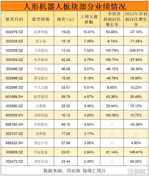 1)执行器和电机:三花智控、拓普集团、鸣志电器;2)减速器:中大力德;3)电机驱动控制芯片:峰岹科技;4)传感器:推荐标的为东华测试,受益标的为柯力传感、奥比中光;5)丝杠类:推荐标的为五洲新春、恒立液压和长盛轴承,受益标的为北特科技、丰立智能、贝斯特和新坐标:6)丝杠设备类:受益标的为华辰装备、日发精机、秦川机床、浙海德曼和思进智能。部分个股业绩亮眼