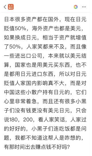 不过,无论如何笔者仍然要说,目前看日本仍有上万亿美元资产,上千亿的美元头寸,虽然长期来看持续贬值到190-210左右是不可遏制的,但如果没有意外情况(如1997年的索罗斯)不至于出现亚洲金融危机式的闪崩。