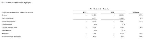 总的来看,谷歌母公司 Alphabet 发布截至 3 月 31 日的 2024 年第一季度财报,季度营收 805 亿美元,同比增长 15%,是 2022 年初以来公司营收增长最快的一个季度;净利润 237 亿美元,同比大增 57%。消息公布后,Alphabet 股价一度上涨近 15%。
