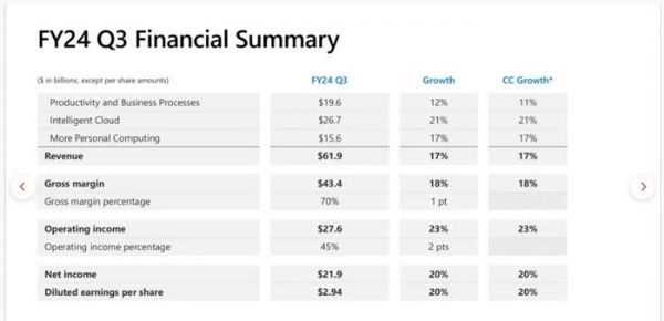 微软公布 2024 财年第三季度,覆盖了 Microsoft 365 Copilot 自去年 11 月面向商业客户推出后的首个完整季度销售额。该季度营收为 619 亿美元,同比增长 17%。净利润为 219 亿美元,同比增长 20%,均摊后每股收益为 2.94 美元。