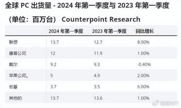 市调机构counterpoint公布的2024年Q1全球PC出货量数据显示,联想同比增长8%,出货量达到1370万台;第二名的惠普出货量达到1200万台,惠普同比仅增长1%,联想继续领先于惠普。