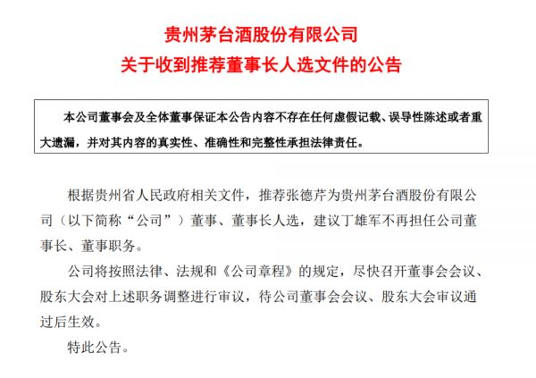 4月29日晚,贵州茅台发布公告,推荐张德芹为贵州茅台酒股份有限公司董事、董事长人选,建议丁雄军不再担任公司董事长、董事职务。
