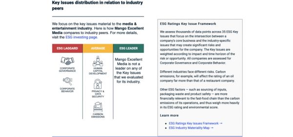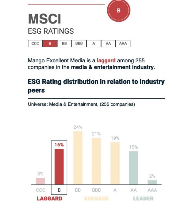 但是,对于投资者越来越重视的ESG表现,该公司却未能拿出同样亮眼的成绩。尤其是MSCI和晨星等具全球影响力的ESG评级机构,最新评级结果分别将芒果超媒纳入“落后者(laggard)”和“高风险”序列。