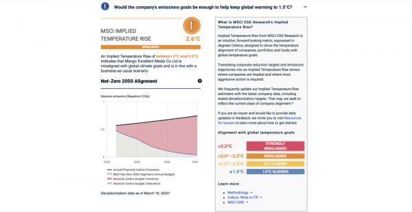 MSCI官网显示,芒果超媒无法对齐全球1.5摄氏度的升温标准