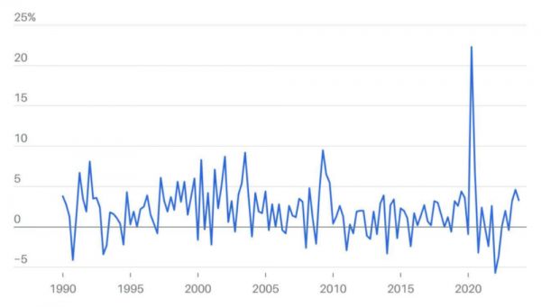 继续增长:美国经济还没有出现专家普遍预测的衰退。实际GDP增长率,来源:美国经济分析局