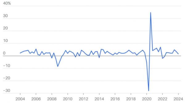 因此,美国经济继续稳步增长,而没有像很多人预测的那样陷入衰退,经济持续增长也影响到了美联储的降息计划。许多经济学家预计美国经济的增长势头将降温,而且事实确实如此,第一季美国GDP年化增长率仅为1.6%,不过,劳动生产率的提升有助于美国经济避免陷入停滞。