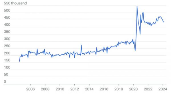 新企业的创办可能是近期生产率提升的最大推动力之一,成为美国经济持续增长的助推力。根据美国人口普查局的数据,从2021年1月到2024年3月,美国新企业申请量达到1730万,过去三年,与2004年至疫情暴发前这段时期的水平相比,每月申请量几乎翻了一番。
