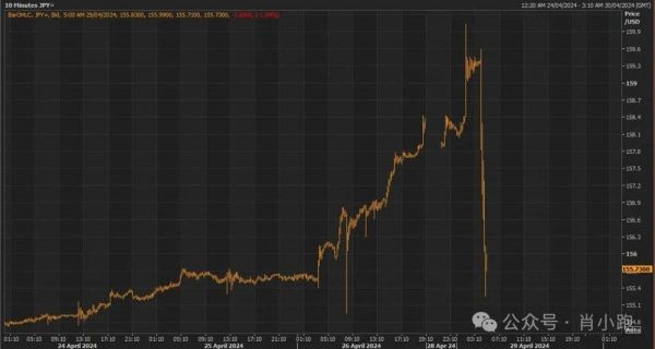 这阵子日元跳楼式自由落体,三周内购买力缩水4%,一路狂奔跌破160大关,刷新34年新低。直到4月29日早盘——日元在一路急坠后拉起500点——之前,日央行对贬值一直置若罔闻,没怎么动手干预。感觉不是因为束手无策,而是还没想好怎么解决“这个问题”。
