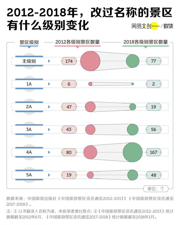 在 369 个改名景区中,有 174 个在 2012 年是没有级别的,占了近一半。而改名之后,很多景区的级别都有所上升,不少都升级到了 3A 与 4A。