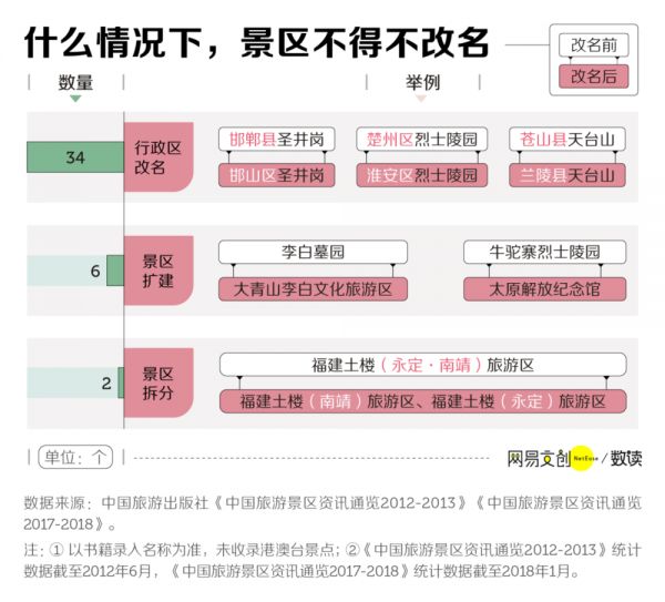 改名字的好处显而易见,为了找到近年来有多少景区改过名字,我们对中国旅游出版社《中国旅游景区资讯通览 2012-2013》与《中国旅游景区资讯通览 2017-2018》两本书中的景区名录进行了比对,发现有 369 个景区改过名字。