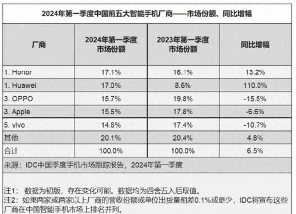 2024年前3周销量Top5:华为>苹果>VIVO>荣耀>OPPO,小米消失