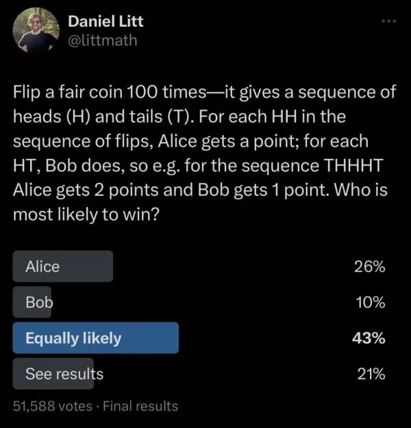 多伦多大学数学系助理教授Daniel Litt发起的概率问题投票截图|图源:littmath@twitter.com。