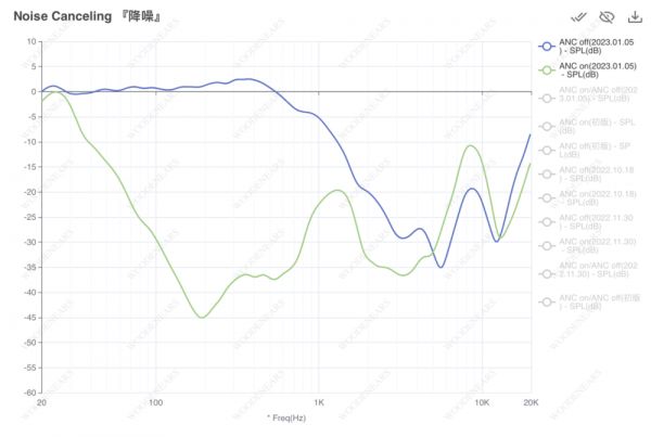 绿线为降噪开启时,蓝线为降噪关闭时丨图片来源 Woodenear