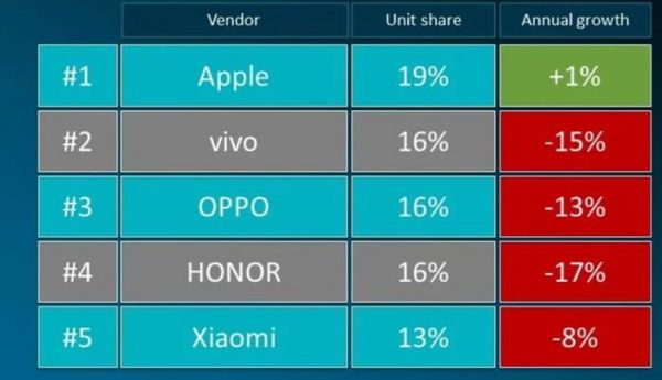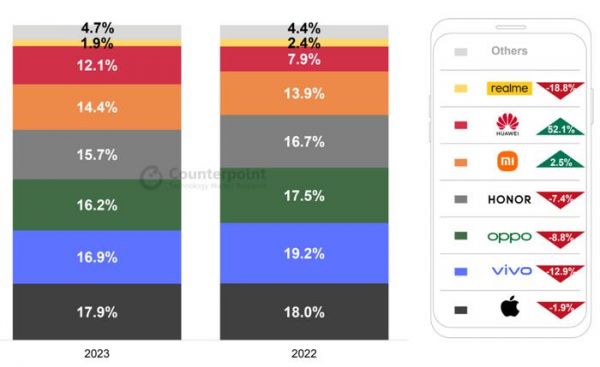 Counterpoint Research的数据显示,苹果第一(17.9%)、vivo第二(16.9%)、OPPO第三(16.2%)、荣耀第四(15.7%)、小米第五(14.4%)。