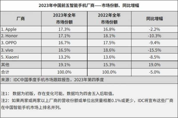 IDC数据显示,苹果第一(17.3%)、荣耀第二(17.1%)、OPPO第三(16.7%)、vivo第四(16.5%)、小米第五(13.2%)。