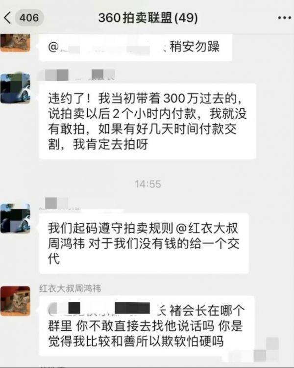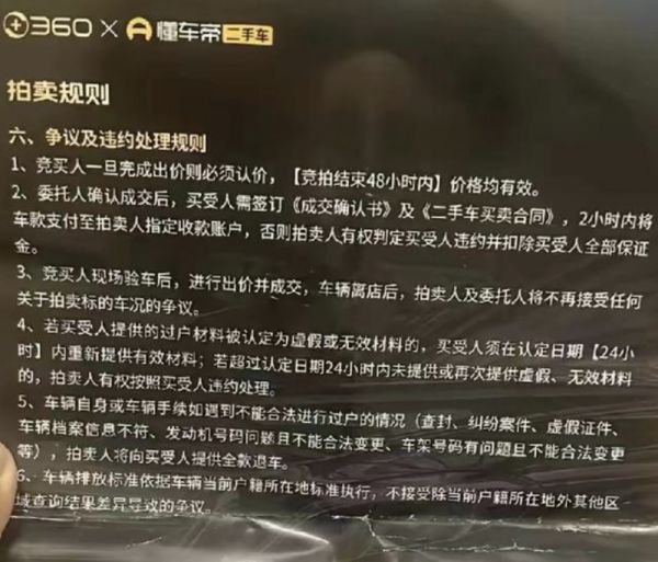 在拍卖会结束,褚会长迟迟未付款之际,参与竞拍但空手而归的车商们首先选择对周鸿祎发难。大家关注的只有一点:为何原本在拍卖会之前就已经被声明的规则:“成交后2个小时内将购车款支付至拍卖人指定收款账户”这一条,褚会长可以不遵守?