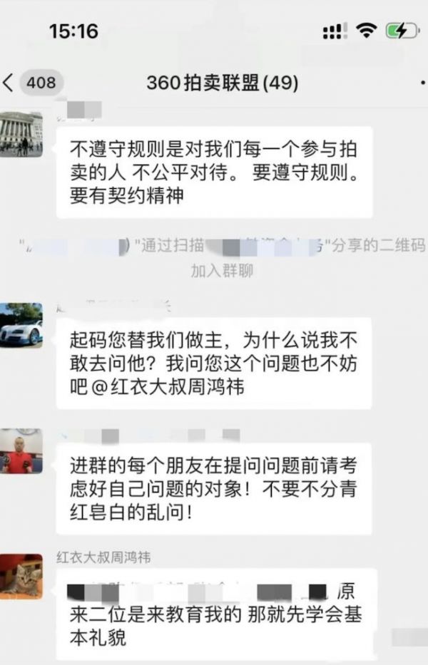 除了周鸿祎疑似被褚会长“戏耍”,这两天让人们津津乐道的,还有他在参与此次竞拍的二手车商群里的破防。显然,窝囊和委屈成为了这个群里的主旋律。