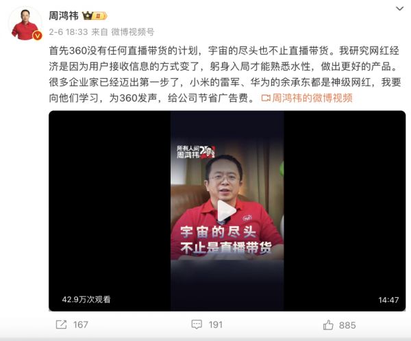可以排除的是,他显然不是为了带货。在2月6日,周鸿祎专门在微博针对媒体报道“360确定将直播带货作为年度规划之一”的传言进行了否定,称他搞流量的目的是为360发声,为公司节省广告费。