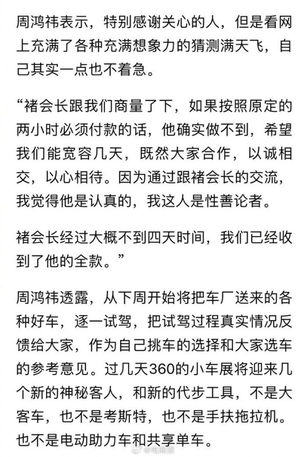周鸿祎凌晨发文:拿到迈巴赫尾款了,我是性善论者,一点不着急。