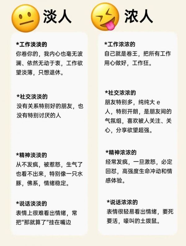 什么意思呢?浓人,指的是性格热烈,情绪外放,对生活充满热情而张扬的人;淡人,指的是情绪平和,随遇而安,做什么都“淡淡的”,没有太大的情绪起伏的人。