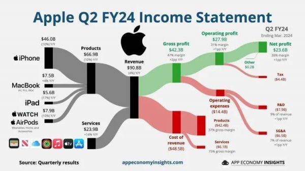 纵观来看,除服务业务增长14.2%至239亿美元外,其余核心业务整体都下滑。更重要的是,在微软、谷歌、Meta等各大互联网巨头都争相进军生成式人工智能、拼得你死我活的时候,苹果的节奏却显得又佛系又被动。