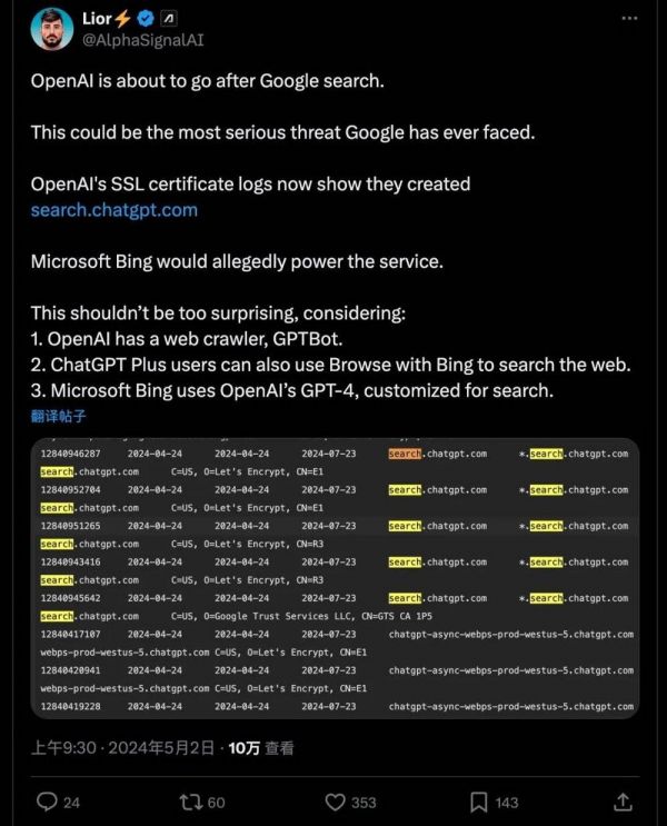 值得注意的是,就在奥尔特曼演讲的同一天,有网友在X上发文表示,OpenAI创建了一个新的搜索服务的域名:http://search.chatgpt.com,并由此推测Open在微软Bing的支持下,可能正在开发一种新的搜索服务。