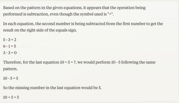 (来源:资料图)由图可知,Claude 根据这些例子意识到“+”其实代表着减法,故能针对“10+5=?”这一新问题给出正确回答。
