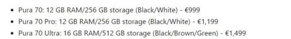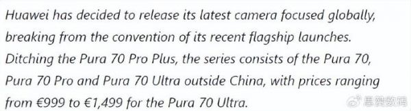 除了系统和网络,Pura 70系列在欧洲市场的硬件配置也做了适当精简。外媒报道,顶配Pura 70 Ultra虽然拥有1英寸大底主摄像头、可变光圈和100倍混合变焦等旗舰影像能力,但它的处理器型号却没有透露。Pura 70 Pro和Pura 70的相机硬件也较中国版有所削减。此外,欧洲版只推出了Pura 70、70 Pro和70 Ultra三个版本,国内版的Pura 70 Pro+则没有身影。