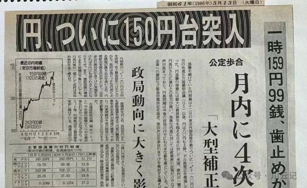 1986年,日元汇率上涨突破1美元兑160日元时的带着兴奋的日本报纸
