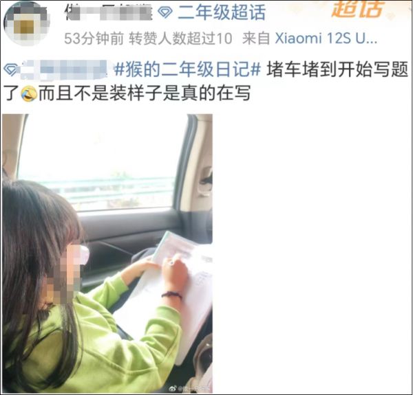 被堵在路上的小学生也没闲着,果断掏出作业本开始就地写作业,也不用担心字歪,毕竟车停得也稳。