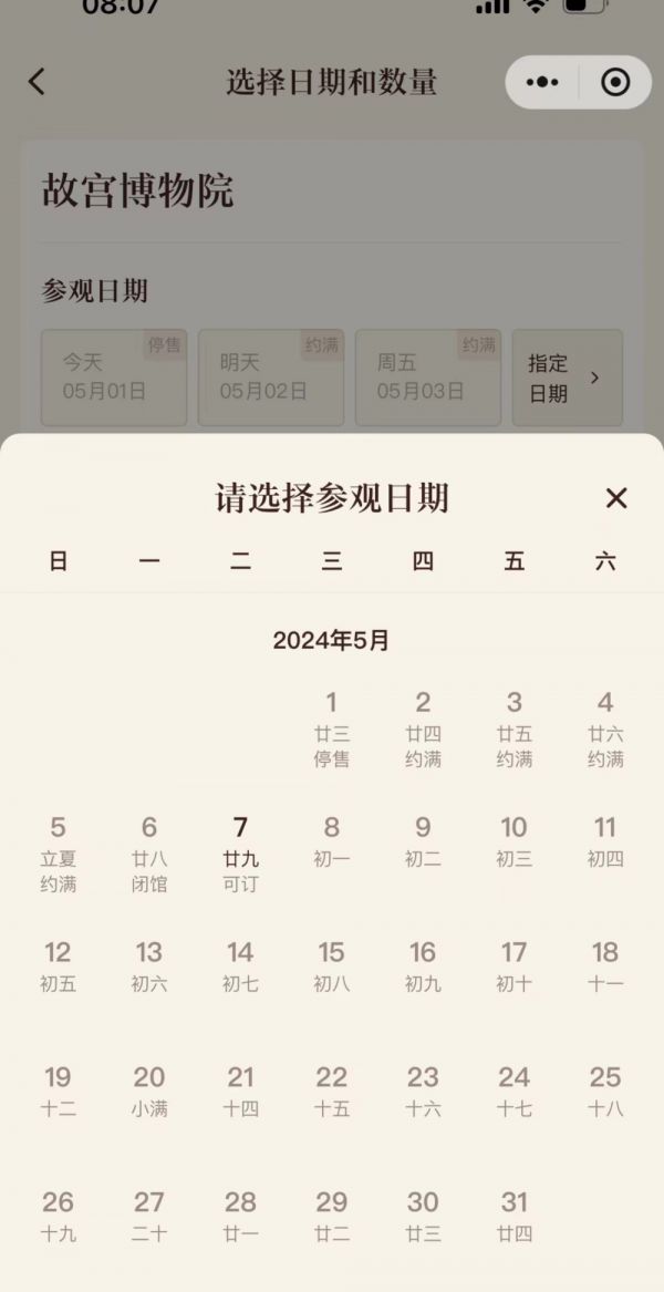 比如故宫的门票,5月1日~5日故宫博物院参观预约显示约满。