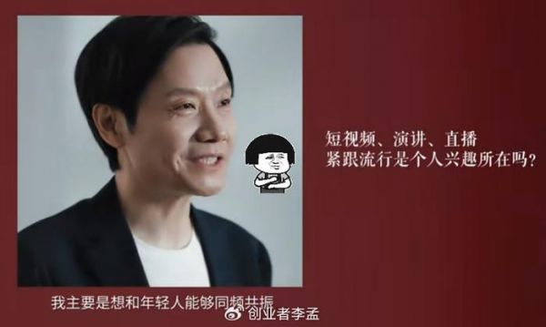 在2024年的5月4日,青年节上!雷军在人民网上再次给年轻人讲了一个主题“敢”,当主持人问到:短视频直播演讲是你的个人兴趣吗?为什么这两年频频的在这方面互动!他说:不是,他想要和年轻人同频共振,能够讲一些我们听得懂的话!