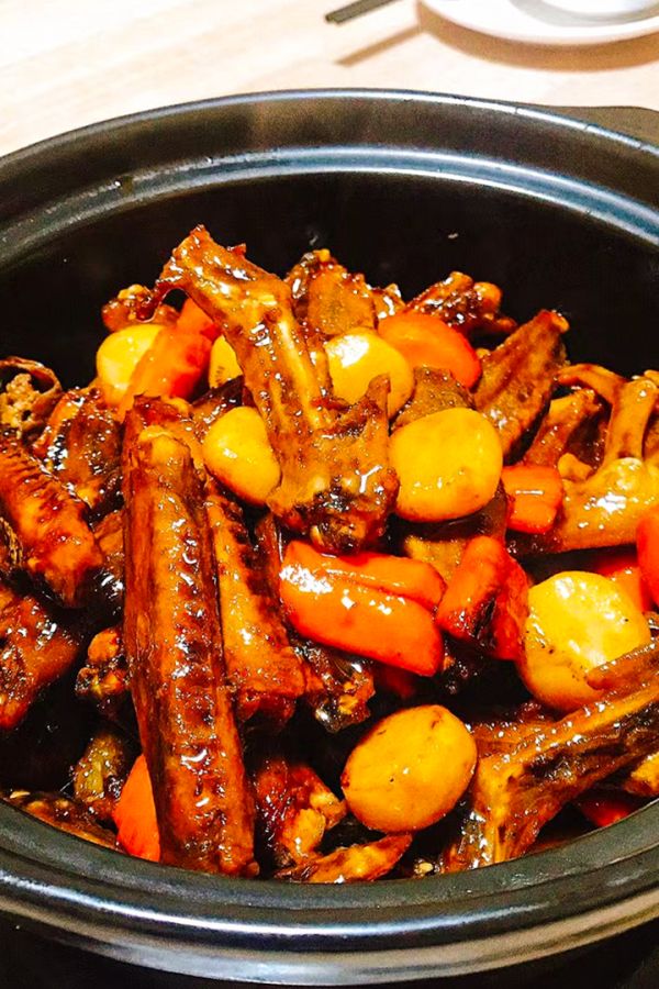 在砂锅中制熟上桌的鸭五件,镬气十足,深褐色的浓稠酱汁油亮亮裹满食材,带骨的鸭货肉不算多,因而更加容易入味,鸭皮和少量鸭肉极富韧性,经过一番撕扯完全离骨入口,浓郁的香气瞬间充斥口腔。切成大滚刀块的胡萝卜和完整不切的马蹄,别看外表和酱汁融为一体,用牙咬开,胡萝卜内里焖得香软,马蹄内芯脆甜多汁,配上外表的酱汁香而不腻。