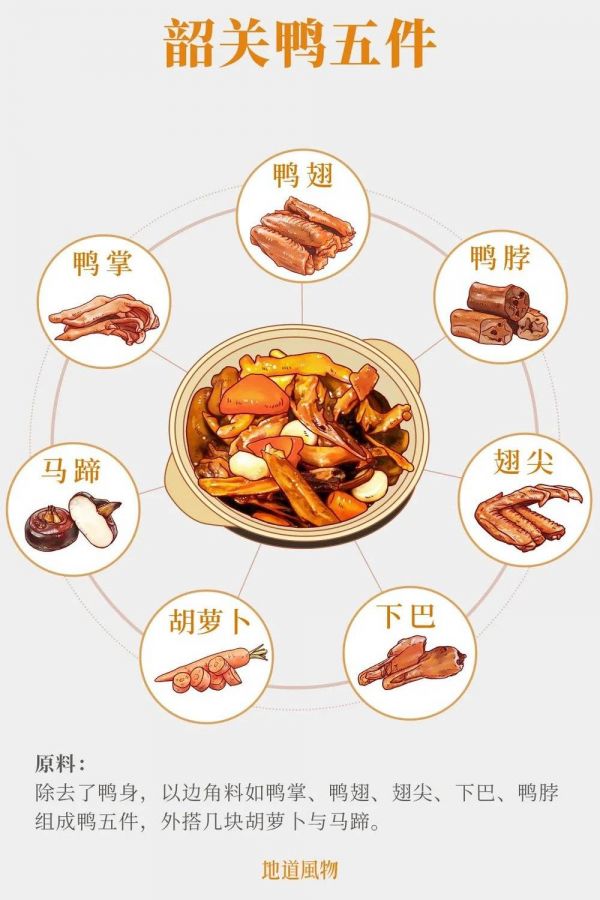 韶关市区的当家名菜:鸭五件,命名逻辑朴素直白,取制作腊鸭剩余的“边角料”:翅中、翅尖、下巴、掌、脖子五件鸭货作主材;加上色泽鲜艳的胡萝卜,清甜无渣、口感爽脆的乐昌马蹄;辅以当地人以南乳、蚝油、沙茶酱等各式调料复配的秘制酱料干煲。